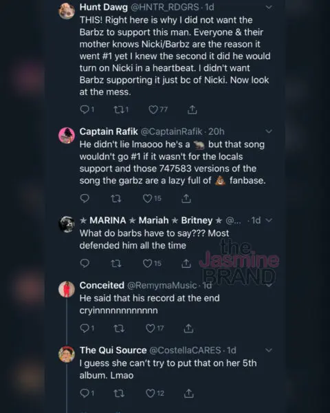 “Nicki is my sister I love that girl to death. When has Nicki ever had a #1 to this date.” He later added,