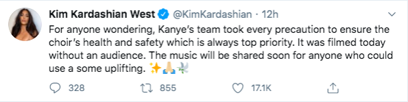 “For anyone wondering, Kanye’s team took every precaution to ensure the choir’s health and safety which is always top priority. It was filmed today without an audience. The music will be shared soon for anyone who could use a some uplifting.”
