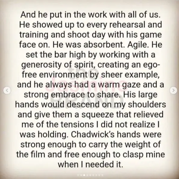 “And he put in the work with all of us. He was absorbent. Agile. He set the bar high by working with a generosity of spirit, creating an ego-free environment by sheer example, and he always had a warm gaze and a strong embrace to share. His large hands would descend on my shoulders and give them a squeeze that relieved me of the tensions I did not realize I was holding. Chadwick’s hands were strong enough to carry the weight of the film and free enough to clasp mine when I needed it.”