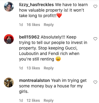 “Ain’t no more Cartiers, it ain’t no more Louboutin, no more Louis, ain’t no mo’…Go get you some property please. Please y’all go buy some property. Okay? Get in [ownership] okay?”