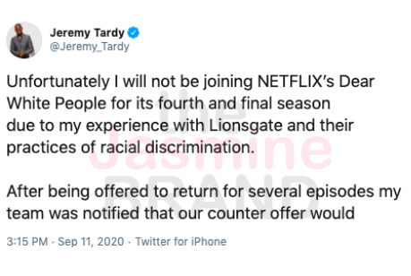 “Unfortunately I will not be joining NETFLIX’s Dear White People for its fourth and final season due to my experience with Lionsgate and their practices of racial discrimination. After being offered to return for several episodes my team was notified that our counter offer would not be considered and that the initial offer was the “best and final”. This news was disturbing because one of my white colleagues — being a true ally — revealed that they too had received the same initial offer and had successfully negotiated a counter offer.”