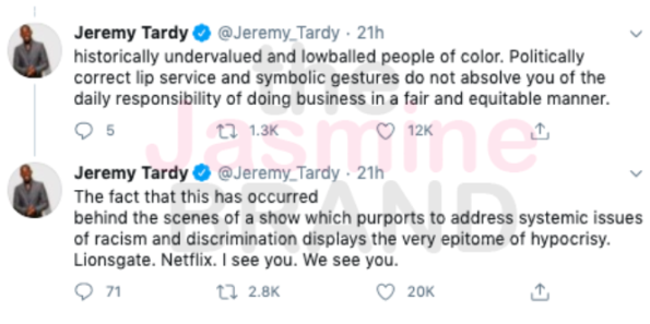 “With this information six recurring cast members, along with myself, banded together on Monday, August 30th to pass on Lionsgate’s initial offers. Our stance was to move powerfully as a unit in the negotiation process and, more importantly, to stand on principle because this is not simply a monetary matter. We were all aware of the notorious pay disparities between people of color and our white colleagues on Netflix and Lionsgate shows; so this made it blatantly obvious. However, our collective bargaining power was undermined with side deal offers and lack of transparency. These tactics led to some individuals taking deals before the collective group received a fair and equitable negotiation process.”