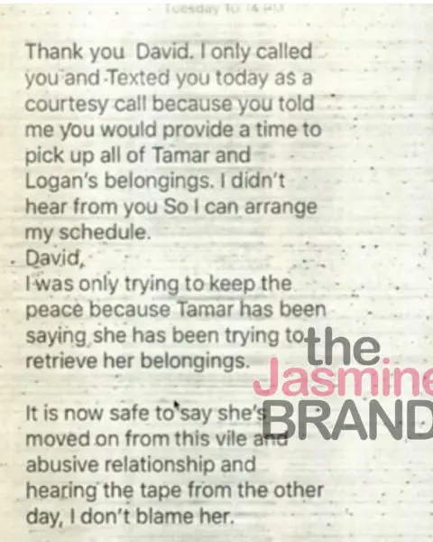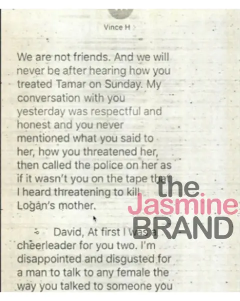 Tamar Braxton and Fiancé, David Adefeso’s relationship has been front and center since claims of domestic violence and abuse recently surfaced. Earlier this week, Tamar Braxton made claims that fiancé David Adefeso assaulted her and threatened a Murder- Suicide. Throughout these unfortunate events, it looks like the 43-year old singer is receiving support from her Ex-Husband Vincent Herbert. Text messages from Vincent to David have leaked (via Lailah Lynn) and it looks like Vincent is standing by his Ex-Wife’s side. In the alleged texts messages, Vincent addresses David’s alleged abuse towards Tamar as well as no longer allowing David to have a relationship with their son Logan. The alleged messages also reveal Vincent trying to coordinate with David in order to retrieve Tamar and Logan’s belongings.