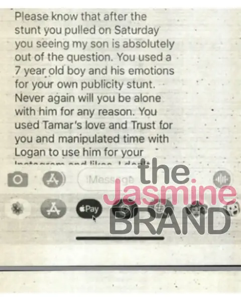 “We are not friends. And we will never be after hearing how you treated Tamar on Sunday. My conversation with you yesterday was respectful and honest and you never mentioned what you said to her, how you threatened her, then called the police on her as if it wasn’t you on the tape that I heard threatening to kill Logan’s mother.”