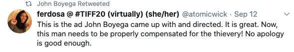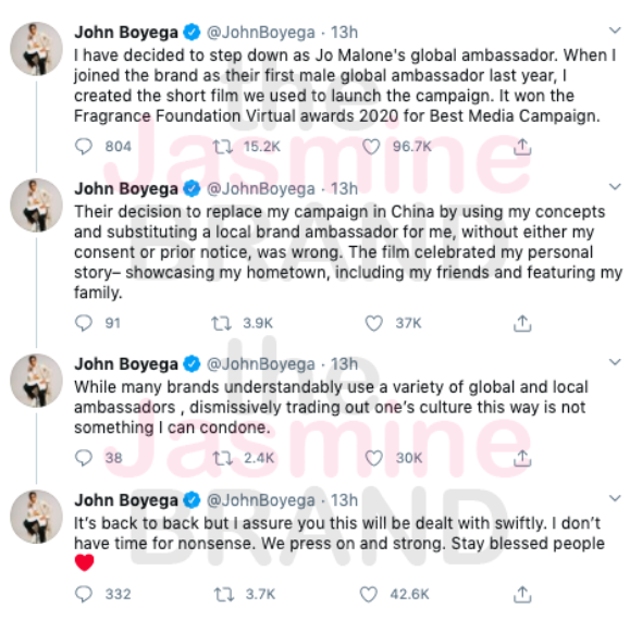 British perfume brand, Jo Malone, has apologized to the actor after cutting him out of a Chinese version of the commercial and replacing him with Liu Haoran (star of the hugely popular Detective Chinatown film franchise). Though John Boyega has not made a public statement, he seems to agree with Twitter users are who upset about the decision by retweeting their comments.