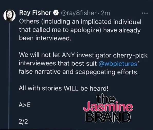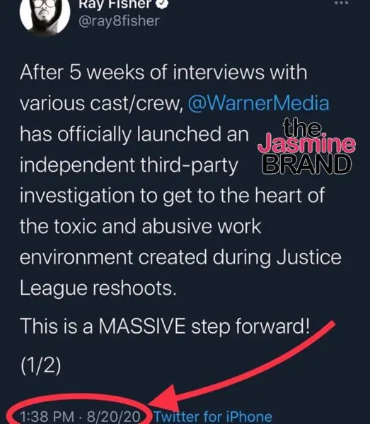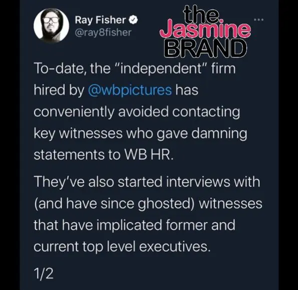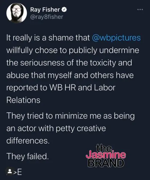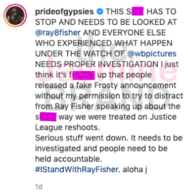 THIS S*** HAS TO STOP AND NEEDS TO BE LOOKED AT @ray8fisher AND EVERYONE ELSE WHO EXPERIENCED WHAT HAPPEN UNDER THE WATCH OF @wbpictures NEEDS PROPER INVESTIGATION I just think it’s f***ed up that people released a fake Frosty announcement without my permission to try to distract from Ray Fisher speaking up about the sh*tty way we were treated on Justice League reshoots.
