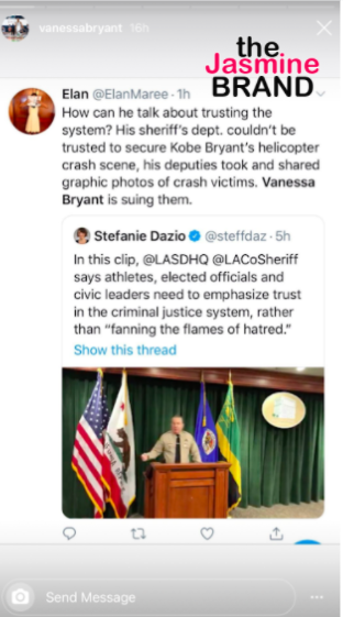 “How can he talk about trusting the system? His sheriff’s dept. couldn’t be trusted to secure Kobe Bryant’s helicopter crash scene, his deputies took and shared graphic photos of crash victims. Vanessa Bryant is suing them.”
