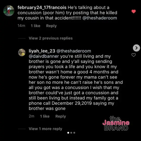 Another family member of Jeremy Evans, commented under David Banner’s (now deleted) posts adding that they wish Jeremy walked away with just a concussion.