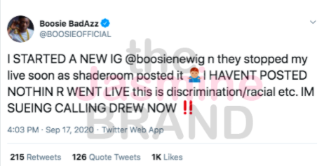“I started a new IG @boosienewig n they stopped my live soon as shaderoom posted it I haven’t posted nothin r went live this is discrimination/racial etc. I’m sueing calling Drew now!!”