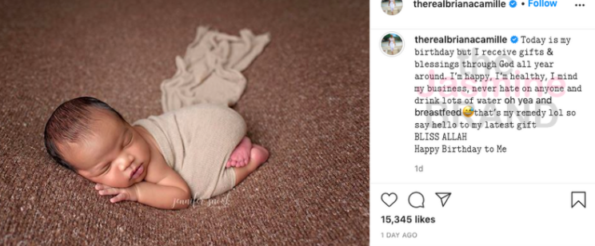 “Today is my birthday but I receive gifts & blessings through God all year around. I’m happy, I’m healthy, I mind my business, never hate on anyone and drink lots of water oh yeah and breastfeed… that’s my remedy lol so say hello to my latest gift BLISS ALLAH Happy Birthday to Me”