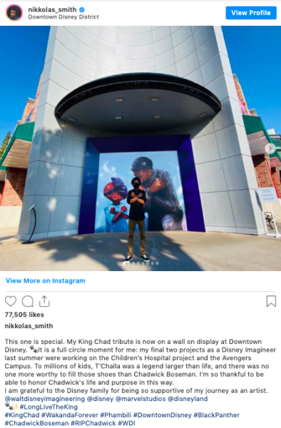“Earlier today, concept artist @Nikkolas_Smith was among the first to see his artwork, “King Chad,” displayed in #DowntownDisney. The art installation pays tribute to ‘Black Panther’ star Chadwick Boseman with the inscription: