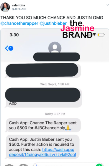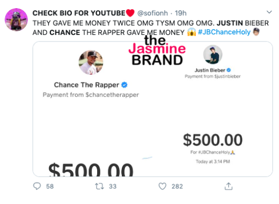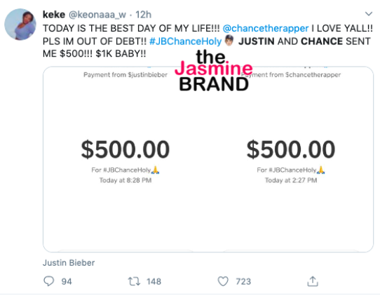 A handful of fans thanked Chance The Rapper and Justin Bieber by sharing their Cash App receipts.