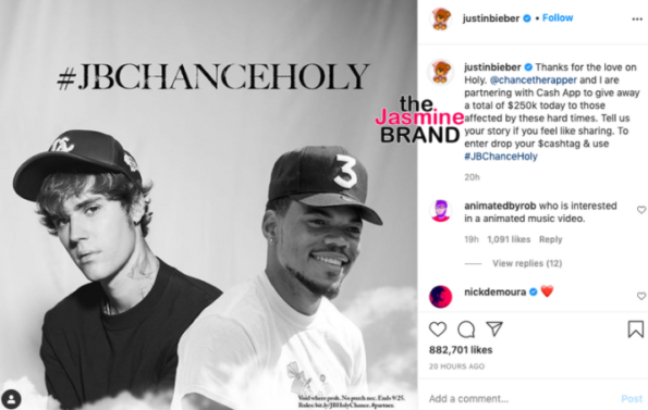 “Thanks for the love on Holy. @chancetherapper and I are partnering with Cash App to give away a total of $250k today to those affected by these hard times. Tell us your story if you feel like sharing. To enter drop your $cashtag & use #JBChanceHoly“