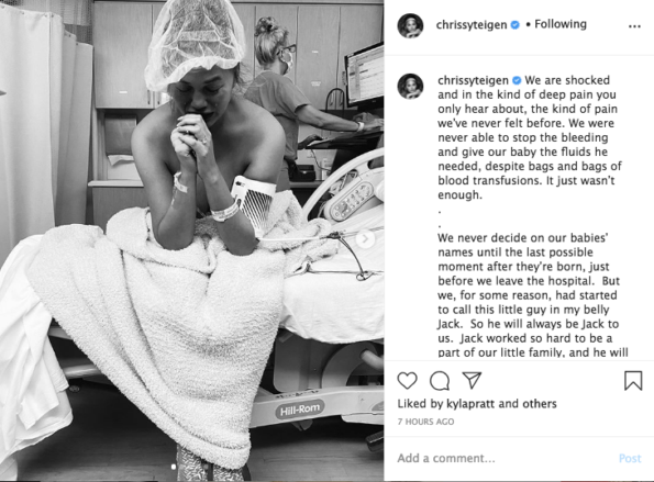 Very sad news. Chrissy Teigen and John Legend have lost their child following pregnancy complications. The news was announced on Chrissy Teigen’s social media accounts. The post featured the super model and TV personality in the hospital room, in bed in tears. She writes: