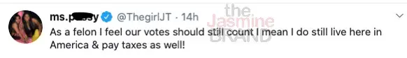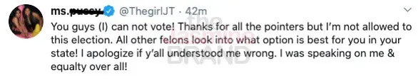 Being a felon in America and not being able to vote has progressively become more of a hot topic amidst rising political views and racial injustice in the U.S. Rapper JT of the Miami-based duo, City Girls, is the latest to speak out on this topic.