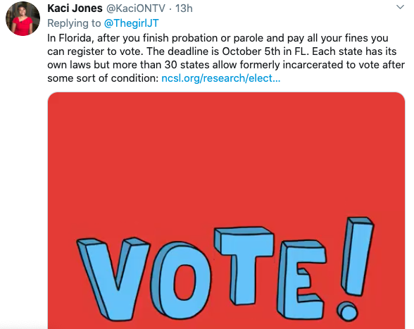 After responding and retweeting several responses regarding her right to vote, JT tweeted that appreciated the pointers but still can’t vote.