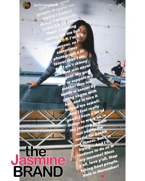 “Last week some people dragged me saying I look sickly. I’m honestly a size 12. 180 lbs. There’s nothing skinny abt me but my neck. I’m 5’8 however, so I sometimes photograph a little leaner than I am. But I ain’t skinny and that was never my goal. My goal was to support my mother thru her battle w cancer by going vegan with her, and in turn it helped me as well. And I feel really good.”