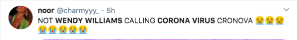 I can’t stop thinking about Wendy Williams referring to coronavirus as “cronova” pic.twitter.com/uzzvyLTwm1