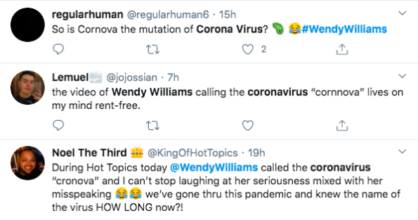 Wendy Williams read his tweet on-air and pronounced coronavirus as ‘cronova’ two separate times. She said,