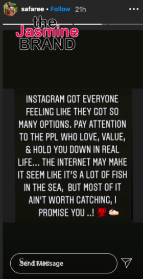 “Instagram got everyone feeling like they got so many options. Pay attention to the people who love, value, & hold you down in real life… The internet may make it seem like it’s a lot of fish int he sea, but most of it ain’t worth catching, I promise you..!”
