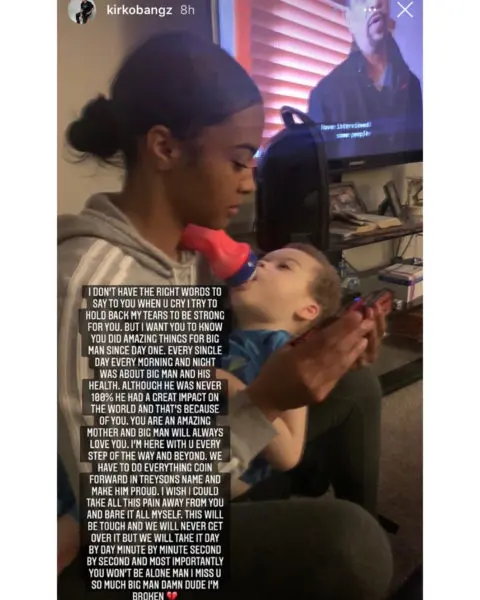 In a separate post on his Instagram Story, Kirko Bangz also shared a kind message to the mother of his son thanking her for all she has done to help and support their son. He wrote,