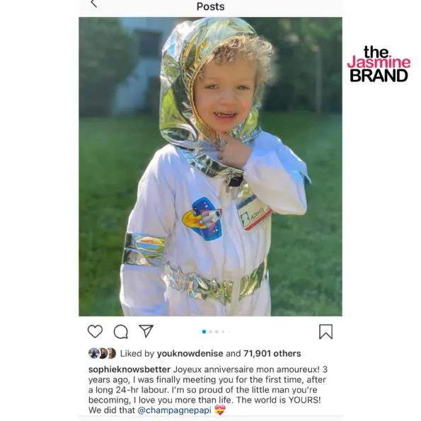 “Joyeux anniversaire mon amoureux! 3 years ago, I was finally meeting you for the first time, after a long 24-hr labour. I’m so proud of the little man you’re becoming, I love you more than life. The world is YOURS! We did that @champagnepapi ?”