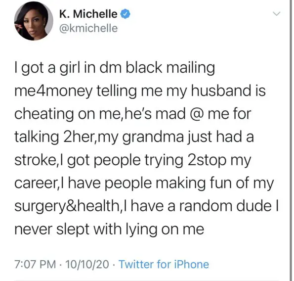 “I got a girl in dm black mailing me4money telling me my husband is cheating on me,he’s mad @ me for talking 2her,my grandma just had a stroke,I got people trying 2stop my career,I have people making fun of my surgery&health,I have a random dude I never slept with lying on me”