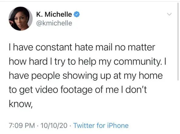 Artist/Singer K. Michelle (real name Kimberly Michelle Pate) rose to fame for her sultry singing voice and heartbreak ballads. Now K. Michelle is causing some heads to turn after posting some concerning tweets on Saturday, October 11 surrounding her mental health and social life.