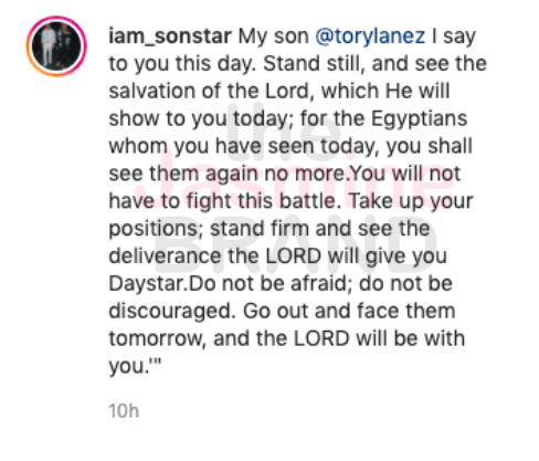 Tory Lanes’s father, Sonstar, also spoke out and shared an encouraging message to his son following the news of the charges. Sonstar wrote: