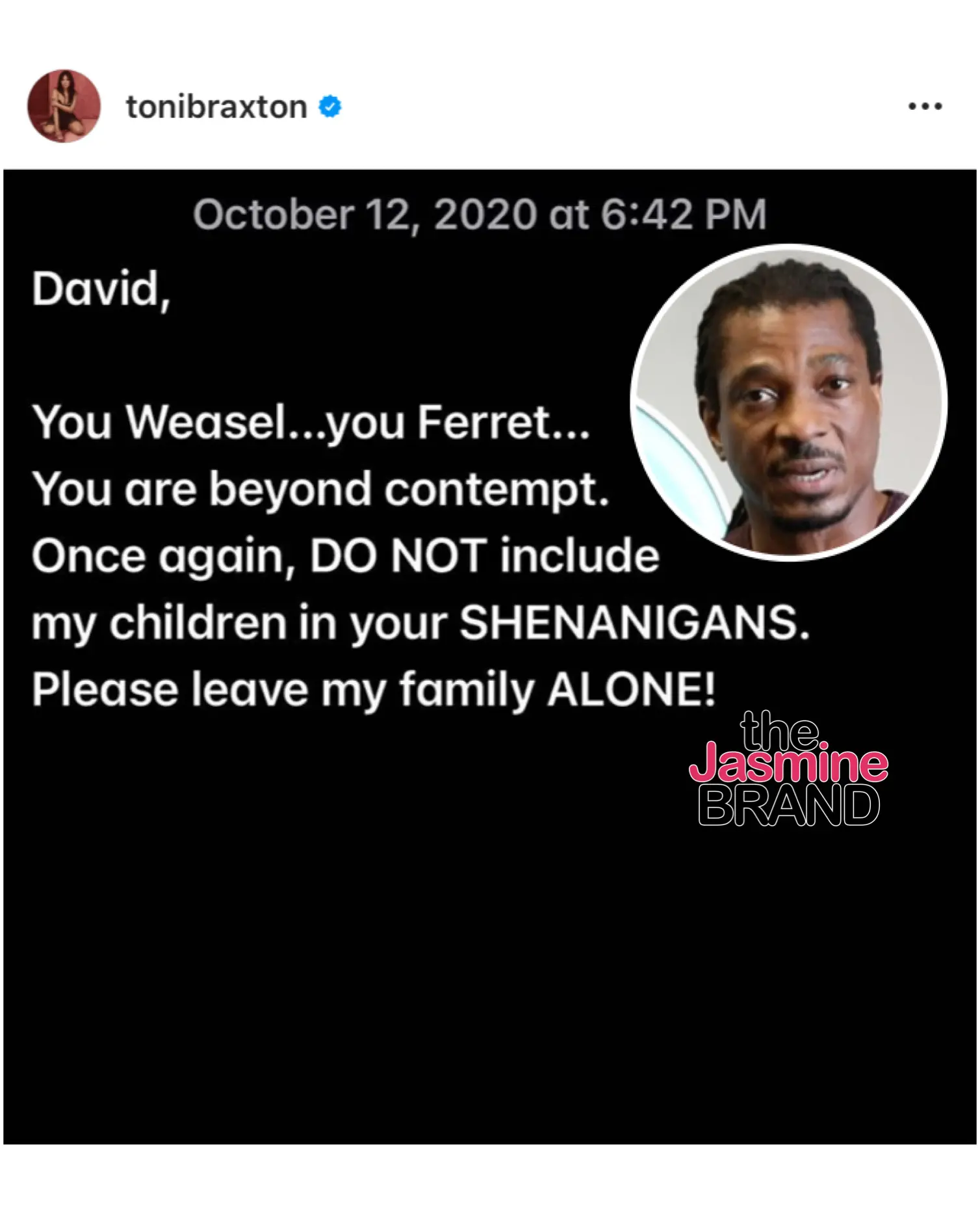 Toni Braxton is lashing out at her sister Tamar Braxton’s ex, David Adefeso. The eldest Braxton sister took to social media, calling him out directly. She writes: