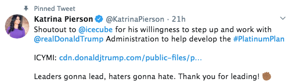 According to the PDF provided by Katrina Pierson, the “Platinum Plan” lays out Trump’s plans to help Black america over the next four years. The document promises new jobs, better education and job training opportunities, new black owned businesses and more.
