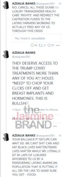 While it’s unclear which tweet specifically caused the suspension of Azelia Banks’ account, she went on a tangent about “luxury transgender health care rights”, violating Twitter’s “hateful conduct policy“. Read her tweets below.