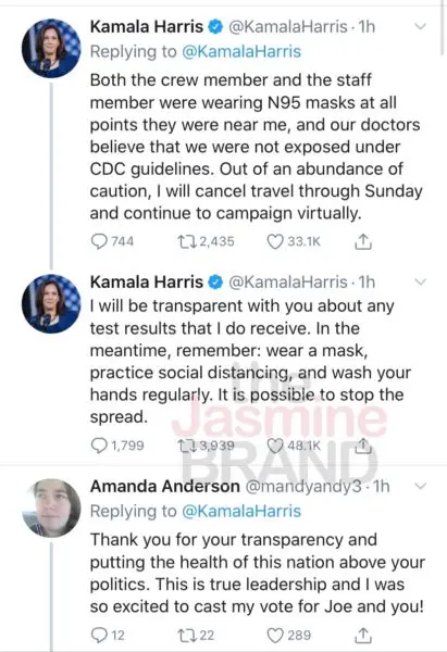 COVID-19 is still spreading rapidly throughout the United States, and now Vice President hopeful, Kamala Harris announced that a member of her team has tested positive for the virus. She made the public of aware of the latest news via Twitter and also announced that “out of an abundance of caution,” she will cancel travel through Sunday and campaign virtually. According to reports Harris had been scheduled to travel Thursday to North Carolina for events encouraging voters to cast early ballots.