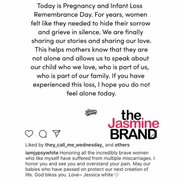 Model Jessica White shared on social media that she’s had to cope with heartbreaking and numerous miscarriages. On Thursday (October 15), the 36-year-old posted a sweet and supportive message on her Instagram to women who can relate to having lost babies, born and unborn:
