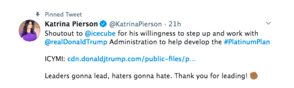 The controversy surrounding Cube’s connection to the Trump administration started with a tweet sent out by a senior-level Trump advisor Katrina Pierson.