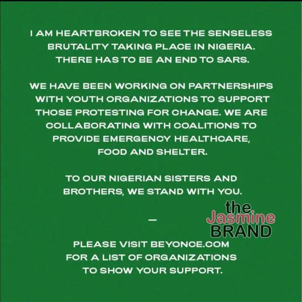 Beyonce Shares #EndSars Message After Nigerian Singer Tiwa Savage Publicly Asks For Her Help + Beyonce’s Publicist Slam Criticism: “Not All Activists Live On Social Media”