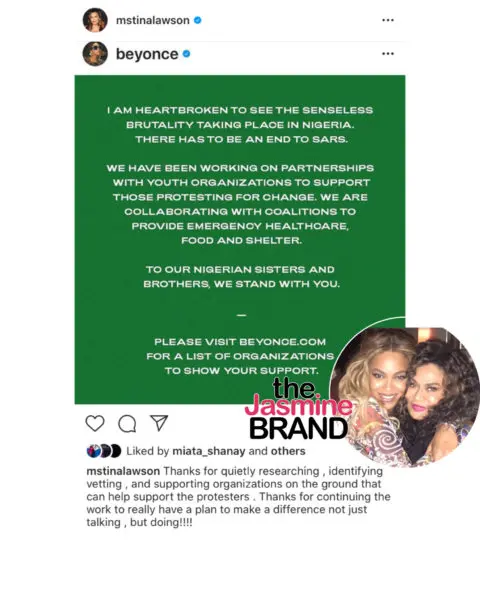 Beyonce Shares #EndSars Message After Nigerian Singer Tiwa Savage Publicly Asks For Her Help + Tina Knowles And Beyonce’s Publicist Slam Criticism: “Not All Activists Live On Social Media”