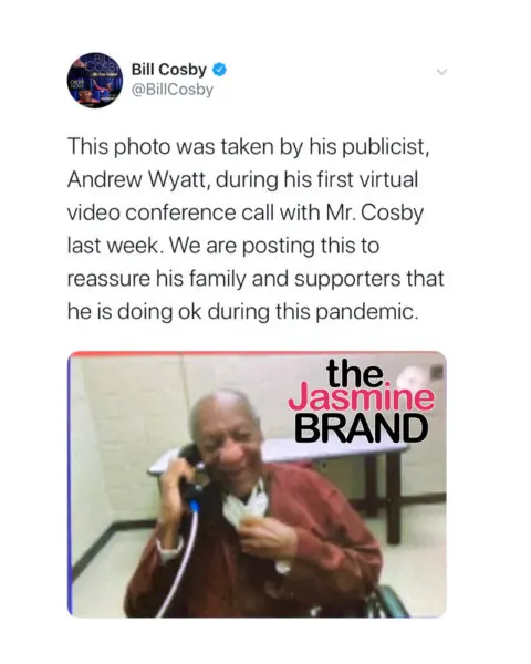 This photo was taken by his publicist, Andrew Wyatt, during his first virtual video conference call with Mr. Cosby last week. We are posting this to reassure his family and supporters that he is doing ok during this pandemic.