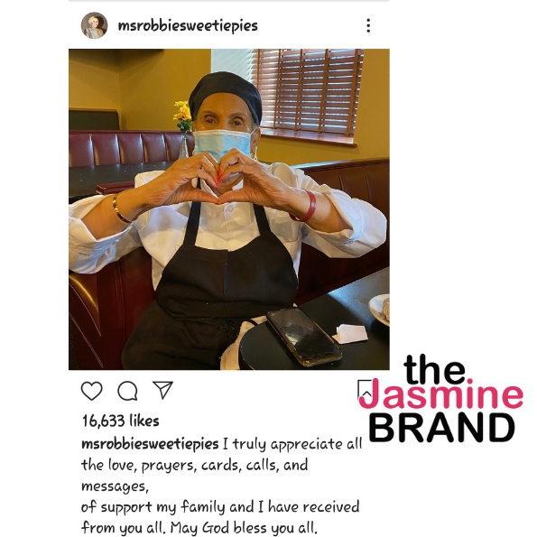 Now, Ms. Robbie has taken to her Instagram to share a short message and a photo of her seated in a booth of what appears to be one of the locations of her Sweetie Pie’s restaurants wearing a pandemic-friendly mask and holding her hands up in the shape of a heart. She captioned the photo: