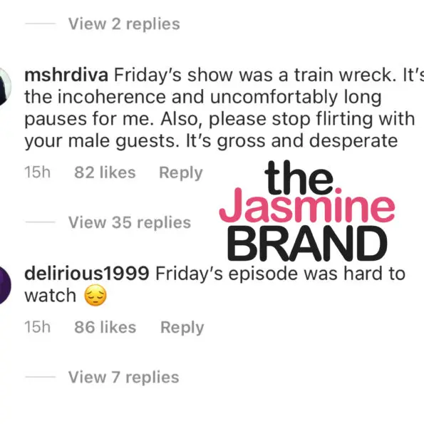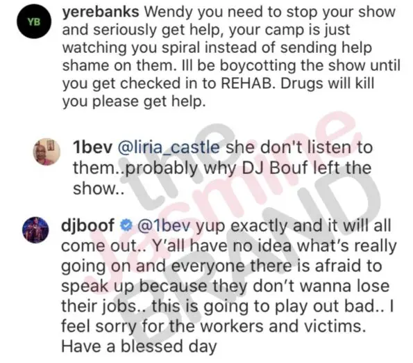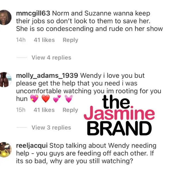 “Wendy you need to stop your show and seriously get help, your camp is just watching you spiral instead of you sending help shame on them. Ill be boycotting the show until you get checked in to REHAB. Drugs will kill you please get help”