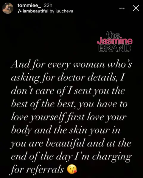 “And for every woman who’s asking for doctor details. I dont care of I sent you the best of the best you have to love yourself first love your body and the skin your in you are beautiful and at the end of the day I’m charging for referrals”