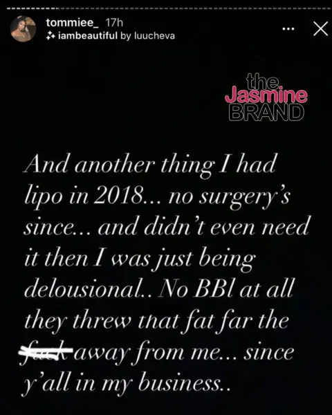 “And another thing I had lipo in 2018…no surgery’s since… and I didn’t even need it then I was just being delusional.. No BBl at all they threw that fat far the f**k away from me… since ya’ll in my ..business”