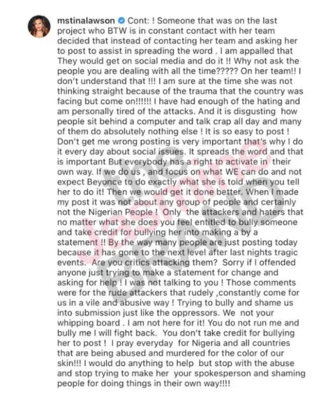 After Tiwa Savage called on Beyonce to use her platform to bring awareness to #EndSars currently going on in Nigeria, Beyonce took to her Instagram on (Oct. 21) directing her fans to Beyonce.com for a list of ways to help, and places to donate. In her post she says,