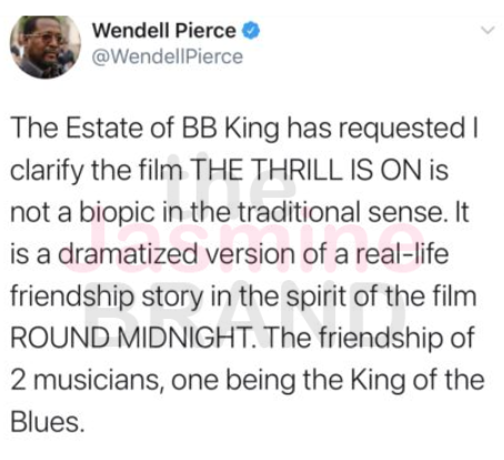 “The Estate of BB King has requested I clarify the film THE THRILL IS ON is not a biopic in the traditional sense. It is a dramatized version of a real-life friendship story in the spirit of the film ROUND MIDNIGHT. The friendship of 2 musicians, one being the King of the Blues.”
