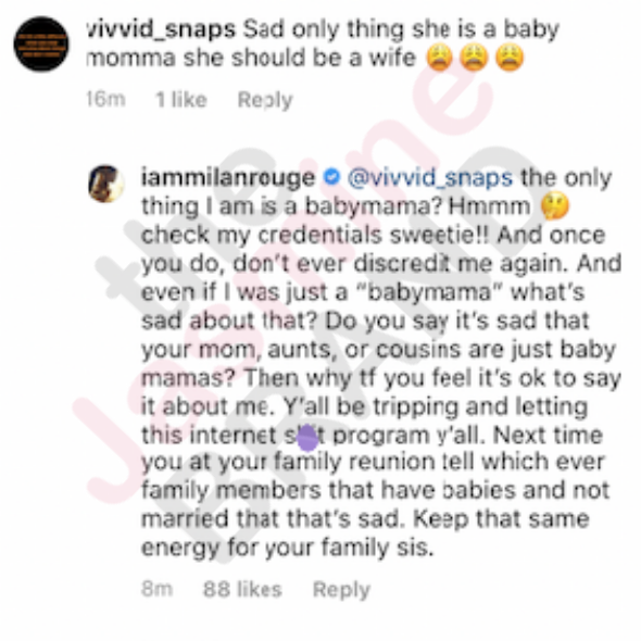 Milan Harris hasn’t been shy about speaking up for herself since the breakup. She also had a response for one commenter who suggested she’s only a “baby mama.”