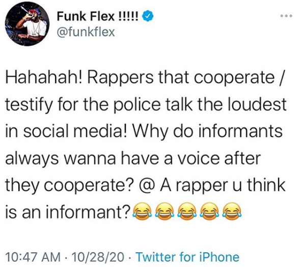 Hahahah! Rappers that cooperate/testify for the police talk the loudest in social media! Why do informants always wanna have a voice after they cooperate? @ A rapper u think is an informant?