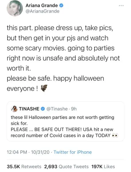 Singers Tinashe and Ariana Grande are advising their fans to stay home and not go out to celebrate Halloween. Although several states have continued to open up bars, night clubs, and restaurants, Covid-19 is still on the rise. Tinashe took to Twitter to share her thoughts on people going out to Halloween parties during a pandemic. She wrote:
