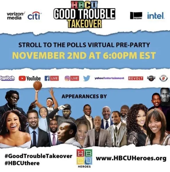 Entertainers, athletes and influencers are uniting for “HBCU Good Trouble Takeover…Walk. Run. Stroll to the Polls,” a virtual pre-party on Election-Day-Eve, Monday, November 2 from 6 p.m. to 9 p.m. ET on a variety of social platforms. The livestream is sponsored by Verizon Media and Citi, with a grant by Arthur M. Blank Family Foundation and includes musical performances by 2 Chainz, Rick Ross, and more.