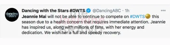 “Jeannie Mai will not be able to continue to compete on #DWTS this season due to a health concern that requires immediate attention. Jeannie has inspired us, along with millions of fans, with her energy and dedication. We wish her a full and speedy recovery.”