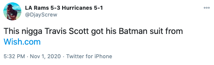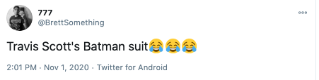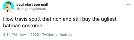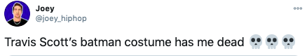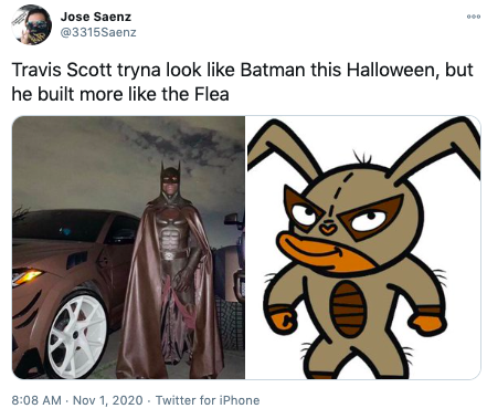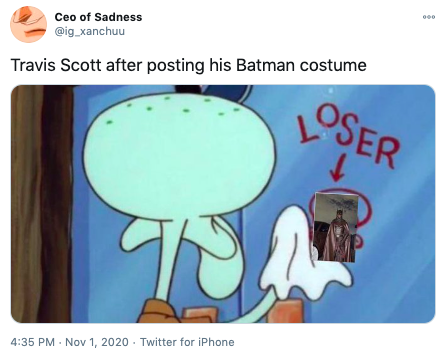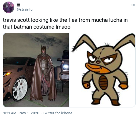 Travis Scott after everyone roasted his batman costume pic.twitter.com/3wOJAbEany
